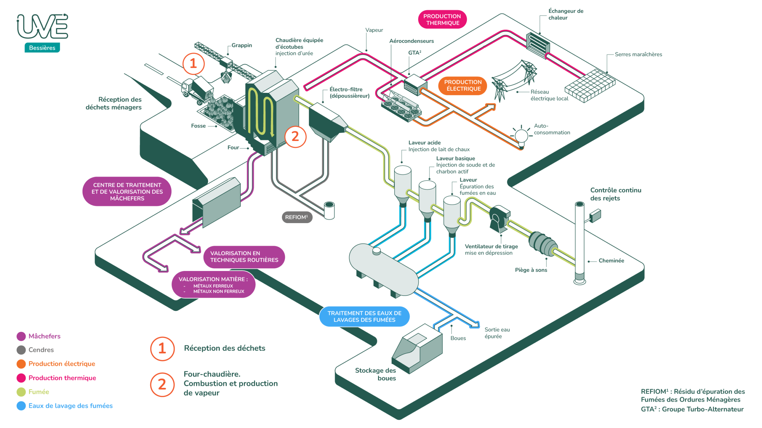 - – Combustion au sein des fours alimentés par un grappin depuis la fosse de stockage des déchets. L’Unité de Valorisation Énergétique de Bessières est équipée de deux lignes de combustion. Chaque ligne comprend un four, une chaudière verticale et un système de traitement des fumées, capable de traiter jusqu’à 11,4 tonnes de déchets par heure ;
